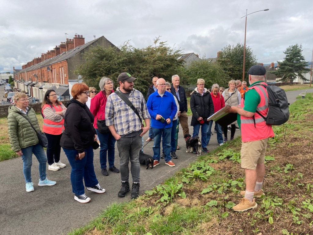 Today, Steven Patterson, Owner of Hometown Tours hosted a free Rail to Trail tour to celebrate the European Heritage Open Day. The tour started at CS Lewis Square, we took a look at some of the cool sculptures that celebrate the books of CS Lewis. We moved across the Newtownards Road and took a look at a wall that has many times been falsely named as one of the Holywood Arches. Then, Steven brought us up the path to take a look at the site of the old Bloomfield Railway Station, and pointed out how many of the homes along the route faced the old railway line. The fascinating part of this was that he showed us a picture of the left overs of an 11th night bonfire and how the local community changed the landscape so that it would not go to wreck again. We then moved up the Comber Greenway to the North Road bridge, where Steven pointed out the differences between the old bridge from the Early-Mid 1800’s to the Newer, more concrete extension of the bridge from the 1960’s. Here, he talked about the fact that in the 1980’s, the old rail line was changed into a lake with boardwalk until the early 2000’s when Northern Ireland Water tore up the old boardwalk, drained the lake and put sewers down. However, out of this we managed to be able to get a tarmac walkway, later named the Comber Greenway. Since that day it has been used by many walkers and cyclists alike and is a great way for the locals to get a walk. We moved along to the end of the tour, where we met with folks from the Friends of Neill’s Hill, who gave us some great detail on the station and what they are doing to preserve the old platform. On my thoughts it was a great tour and a lot of knowledge and spirit went into it. Steven is a great guy and is amazing with what he does, he is very knowledgable in the local area he is from and enjoys doing tours. He also does bicycle tours which from reviews are also very worth looking for!